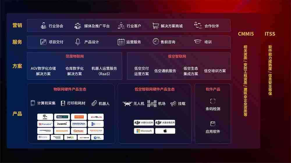聚合国内外先进的物联网硬件产品品牌,,聚焦数字化仓储、、、、机器人运营、、低空智联网等领域,,,共同打造适合客户业务场景的解决方案并提供交付服务